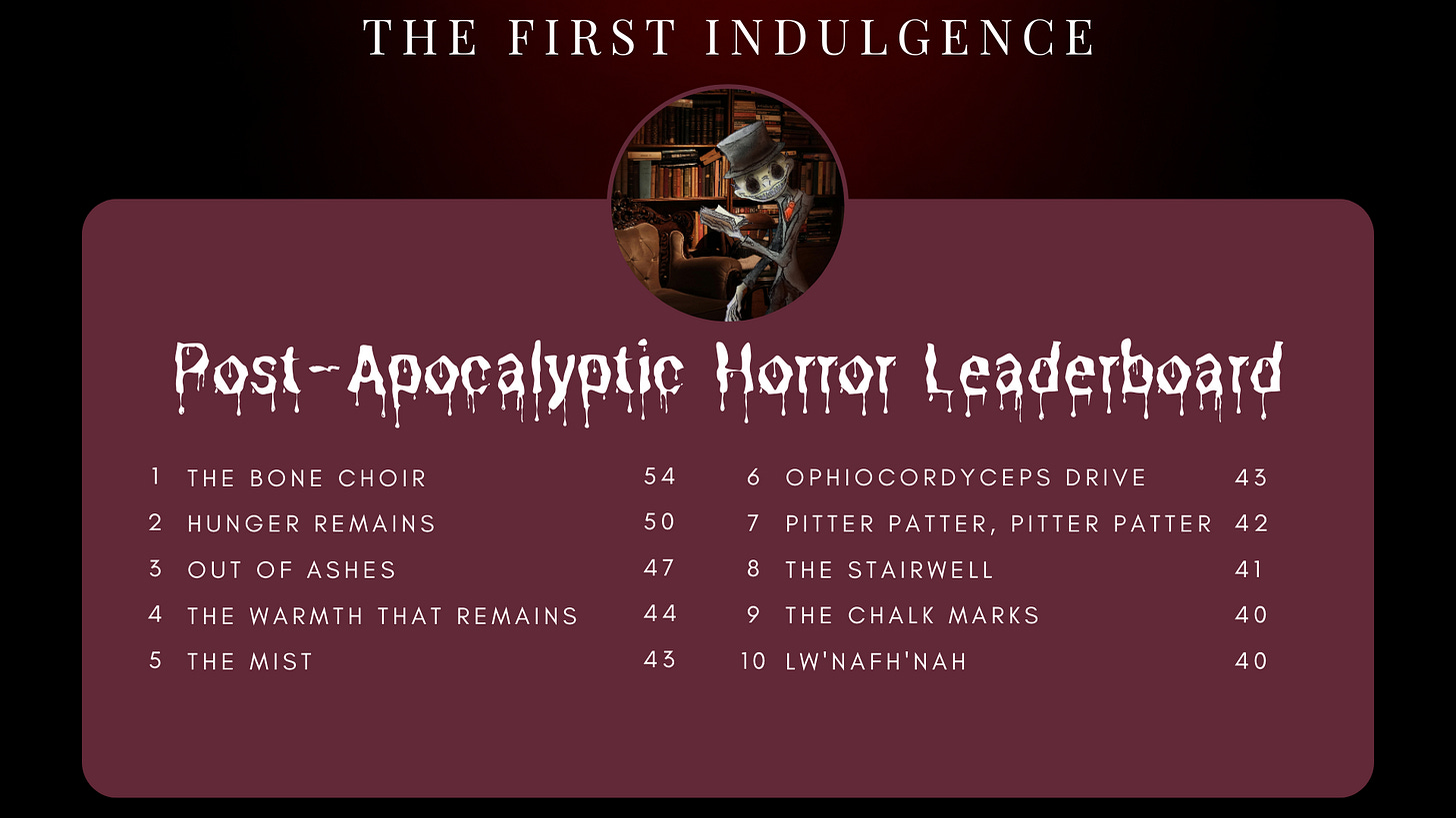 As part of the challenge, I’ll be adding up your likes, comments, and restacks to calculate a total score for each of your works. Each week, I”ll show the top ten stories in each sub-genre of horror.